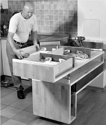 Матеріали для спорудження барної стійки і доповнюючого її столика сервіровки підібрали так, щоб вони добре виглядали в інтер'єрі кухні і відповідали по стилю кухонним шафам. Меблеві щити з клеєної деревини гармонійно поєднуються з керамічною плиткою і іншими матеріалами в обробці кухні. Фасади ящиків оброблені морилкою з відтінком "під вишню".