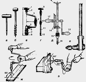 Свердлилка (г) складається зі стального стержня з різьбою 11, патрона для свердла 12, вільно обертаючої головки 9 і металевої ручки-гайки 10. Застосовують його для свердління неглибоких отворів діаметром до 5 мм.