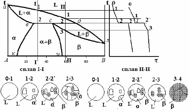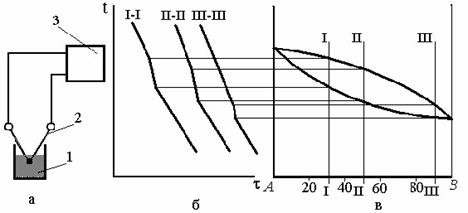 Побудова діаграм стану основана на фіксації характерних точок сплаву, що мають місце при його охолодженні (рис. 1). Для чого в сплав (1), що охолоджується поміщається термопара (2) і спеціальним приладом (3) проводиться запис температури в процесі охолодження сплаву. Аналогічний процес проводиться для декількох складів сплаву. При зміні фазового складу сплаву на кривій зниження температури, в залежності від числа ступенів свободи, буде спостерігатися перегин (рис. 4.1.б), або горизонтальна лінія. Відповідні температури, при яких проходять такі зміни наносяться на вертикальну лінію, яка на діаграмі стану показує склад нашого сплаву. Провівши подібні виміри для декількох сплавів різного складу (рис. 4.1.в) та з’єднавши відповідні точки, отримаємо діаграму стану для подвійних сплавів компонентів А і В.