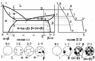 Структури, що утворяться, будуть аналогічні структурам обмеженого твердого розчину з евтектикою (рис 4.4).