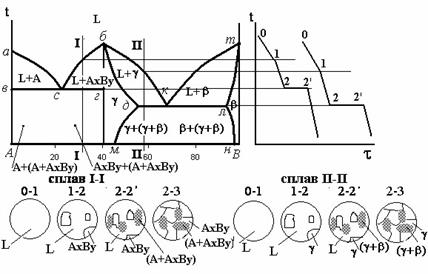 Компонент А утворює з хімічною сполукою АxВy механічну суміш, а компонент В - обмежений твердий розчин. Діаграма стану сплаву механічна суміш дає структури аналогічні рис.4.3 з урахуванням, що одним компонентом сплаву є компонент А, а другим – хімічна сполука АхВу. В другій частині діаграми - обмеженому твердому розчині будуть виділятись структури в вигляді не чистих компонентів, а твердих розчинів. Враховуючи, що тверді розчини позначають маленькими грецькими буквами, позначимо як g-твердий розчин на базі кристалічної гратки хімічної сполуки АхВу і, як звичайно, b - твердий розчин на основі кристалічної гратки компоненту В.