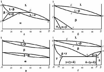Якщо компоненти А і В мають по дві модифікації, причому Аa і Вa так як і Аb та Вb ізоморфні і утворюють необмежені тверді розчини, то діаграма має вигляд зображений на рис. 7.в.