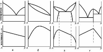 Властивості сплавів, як і тип діаграми визначаються структурами, що утворюються в процесі охолодження. Тому, очевидно, що повинен існува-ти зв’язок між типом діаграми та властивостями сплавів. Узагальнивши багаточисленні дослідження сплавів М.С. Курнаков сформулював правила, що встановлюють зв’язок між типом діаграми та властивостями, зображені на рис 8. Вверху зображені типи діаграм, а внизу залежності властивостей від концентрації компонентів.