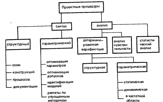 Процедури структурного синтезу по характеру проектованого об'єкта поділяються на синтез схем (принципових, функціональних, структурних, кінематичних і ін), конструкцій (визначення геометричних форм, взаємного розташування деталей), процесів (технологічних, обчислювальних і ін), документації (креслень, пояснювальних записок, відомостей і ін). Основні процедури параметричного синтезу - оптимізація номінальних значень параметрів елементів і їхніх допусків. Важлива задача призначення технічних вимог на параметри об'єкта, розв'язувана при зовнішньому проектуванні, віднесена до задачі оптимізації допусків. Ідентифікація моделей полягає в розрахунку параметрів, які використовуються у ММ. Для процедур оптимізації, як правило, потрібно виконання великого обсягу обчислень за допомогою складних програмних комплексів. В окремих випадках задовільні результати параметричного синтезу виходять на основі спрощених методик, подібних до розрахункових методик неавтоматизованого проектування.