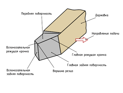 Правым называется резец, у которого при наложении на него сверху ладони правой руки так, чтобы пальцы были направлены к его вершине, главная режущая кромка будет находиться под большим пальцем. На токарных станках эти резцы работают при подаче справа налево, то есть к передней бабке станка.