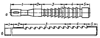 Внутренняя протяжка имеет следующие конструктивные элементы: хвостовик с длиной l1, служит для закрепления протяжки в патроне протяжного станка и передачи силы резания, шейку длиной l2, переходный направляющий конус длиной l3, переднюю направляющую l4, рабочую часть длиной l5, которая состоит из участков длиной l6 с черновыми зубьями, длиной l7 с чистовыми зубьями и участка l8 с калибрующими зубьями, заднюю направляющую часть длиной l9 и задний хвостовик l10. На рабочей части протяжки (длина l5) расположены черновые, чистовые и калибрующие зубья. Чистовые зубья имеют меньший подъем зуба, чем режущие. Режущие зубья предназначены для снятия основного припуска с обрабатываемой поверхности заготовки. Подъем на зуб Sz определяется в зависимости от типа протяжки и обрабатываемого материала. Форма режущих зубьев в сечении, проходящем через ось протяжки. Режущие кромки обычно расположены в плоскости, перпендикулярной к оси. Расстояние между лезвиями режущих зубьев, т. е. шаг р, является одним из основных размеров, определяющих конструктивные элементы, конструкцию протяжки и ее работоспособность. Между зубьями расположены стружечные канавки. Форму и размеры зуба и стружечной канавки устанавливают исходя из условий возможности резания и образования стружки, размещения стружки в канавке и прочности зуба.Они зависят от шага зубьев р, высоты hк стружечной канавки, ширины b спинки зуба, переднего γ и заднего α углов; основание канавки делают в форме дуги радиусом rк. Передний угол γ принимают в зависимости от обрабатываемого материала: для стали γ = 10─20°, для чугуна γ = 5─8°. Задний угол на режущих зубьях α = 3─4°, на чистовых α = 2°, на калибрующих α = 1°. Зубья с прямолинейной спинкой применяют для материалов, дающих стружку надлома, с радиусной спинкой ─для вязких материалов, дающих сливную стружку. Канавки удлиненной формы применяют при обработке отверстий, прерывистых по длине, а также при большой длине протягивания.