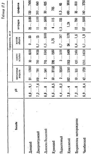 Источниками образования шахтных вод являются подземные горизонты, поверхностные воды, атмосферные осадки и воды, скопившиеся в затопленных горных выработках, а также воды, попадающие в шахты в процессе добычи полезных ископаемых. Шахтные воды подразделяются на два типа: кислые (железосодержащие) и высокоминерализованные. Основными ингредиентами состава шахтных вод являются мелко- Дисперсные взвеси, состоящие из зерен угля и размытых сопутствующих пород, соединения железа, хлориды, сульфаты (табл. 17.2). Кислые шахтные воды отличаются не только низкими значениями рН, но и большим содержанием железа, что существенно осложняет их обработку. Образование кислых шахтных вод связано с окислением веществ, содержащих серу (маркезит, пирит и др.), а также с жизнедеятельностью тионовых бактерий — Thiobacillusthiooxidans, Thiobacillusferrooxidans.