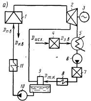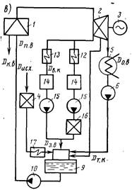 1 — парогенератор; 2 — паровая турбина; 3 — генератор; 4 — химводоочистка; 5 — конденсатор турбины; 6, 10 — конденсатный и питательный насос; 7 — установка очистки конденсата турбины; 9 — Деаэратор; 8 — подогреватель турбинного конденсата; 11 — подогреватель питательной воды; 12 и 13 — теплофикационный и производственный потребители пара; 14 — баки возвратного конденсата; 15 — насосы возвратного конденсата; /б — Установка очистки возвратного конденсата; 17 подогреватель добавочной воды