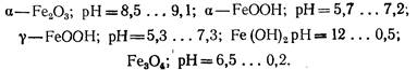 Соединения железа склонны к образованию коллоидных растворов с частицами кристаллической или аморфной структуры. В ряде работ отмечается, что коллоиды α - FeOOHи Fe(OH)3 характеризуются двумя изоэлектрическими точками при рН=6,7 и 12. Как указывалось выше, для различных соединений железа существуют изоэлектрические точки при следующих значениях рН: