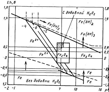 В воде ТЭС могут присутствовать разнообразные соединения железа. Основными факторами, определяющими преимущественное содержание в воде оксидов той или иной формы, являются ее температура, рН и окислительно-восстановительный потенциал Eh. Различные равновесия в системе оксиды—железо- вода оценивают следующим образом: при рН=2...5 преобладает реакция