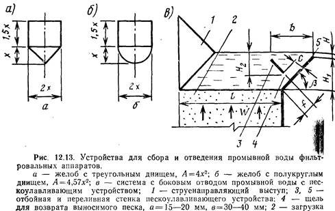 Водовоздушную промывку рекомендуется применять для песчаных фильтров с системой горизонтального отвода промывной воды с пескоулавливающим желобом, образуемым двумя наклонными стенками - отбойной и водосливной (рис.12.13, В). При использовании фильтрующих загрузок из дробленых антрацита и керамзита водовоздушная промывка не допускается.
