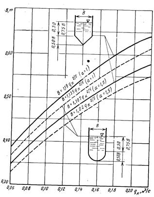 Рис.12.14. Графики для определения размеров желобов с треугольным (1) и полукруглым (2) низом