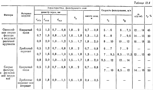 Теоретические исследования, а также опыт эксплуатации фильтров рекомендуют следующие относительные расширения загрузок и необходимые интенсивности промывки (см. табл.12.4). Для антрацитовых загрузок интенсивности промывки следует принимать на 70% меньшими, чем указаны в табл.12.4 для песчаных загрузок скорых фильтров.