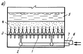 Для загрузок из кварцевого песка при dэ >1 мм в целях повышения эффекта отмывки, снижения расхода промывной воды и уменьшения размеров водоотводящих устройств (желобов, каналов, трубопроводов) целесообразно применение водовоздушной промывки. Ее режим назначается следующим: продувка воздухом с интенсивностью 15.20 л/ (с*м2 ) в течение 1.2 мин, затем совместная водовоздушная промывка с интенсивностью подачи воздуха 15.20 л/ (с*м2 ) и воды 3.4 л/ (с*м2 ) в течение 4.5 мин и последующая подача одной воды с интенсивностью 6.8 л/ (с*м2 ) в течение 4.5 мин. При водовоз душной промывке воду и воздух следует подавать по раздельным трубчатым распределительным системам или через распределительные системы со специальными колпачками.