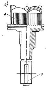 а - колпачковый дренаж; б - колпачок В-1; 1 - длиннохвостый щелевой колпачок; 2 - воздухораспределитель; 3 - "ложное дно" в виде железобетонной плиты; 6,7 - воздух и вода; 4 - фильтрующая загрузка; 5 - "водяная подушка"; 8 - щели; 9 - щель для входа воздуха