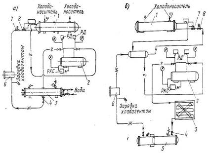 Нами приведены лишь общие данные о новых компрессорных машинах, необходимые для определения основных размеров холодильных установок и станций, расходов энергии и воды в объеме, необходимом для начальных стадий проектирования СКВ. Принципиальные схемы фреоновых поршневых холодильных машин приведены на рис. 1. Перегретые пары хладагента засасываются из испарителя компрессором и поступают в конденсатор — водяной (рис. 1, а) или воздушный (рис. 1,б).