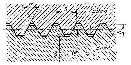 Основными элементами резьбы являются диаметр наружный d, средний d2 и внутренний d1; шаг S, угол профиля а, высота профиля h (рис. 31)