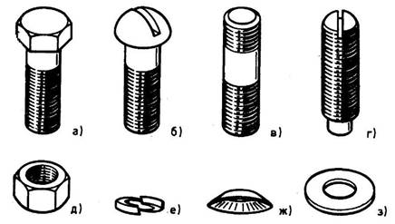 Рис. 1. а — болт; б — винт; в - шпилька; г — установочный винт; д — гайка; e — пружинная шайба; ж — деформируемая шайба; з — плоская шайба