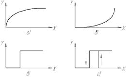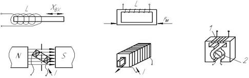 Рис. 1г - ферромагнитный сердечник втягивается в контур (катушку) с током таким образом, чтобы индуктивность контура была минимальной. Сила втягивания при этом пропорциональна квадрату силы тока. Такие преобразователи используются в электромагнитных измерительных приборах.