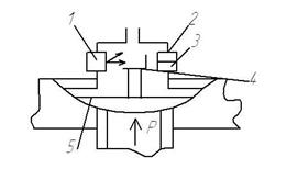 Оптические методы довольно широко используются для измерения давлений. Схема приведена на рис. 6. Между светодиодом 7 и двумя фотоприемниками 2 и 3 размещена шторка 4, перекрывающая поток излучения, который падает на один из фотоприемников 2 или 3. Шторка 4 жестко установлена на эластичной мембране 5, воспринимающей измеряемое давление. Для того чтобы произвести перекрытие светового потока между светодиодом 1 и фотоприемниками 2 и 3, достаточно перемещения шторки 4 на доли миллиметра.