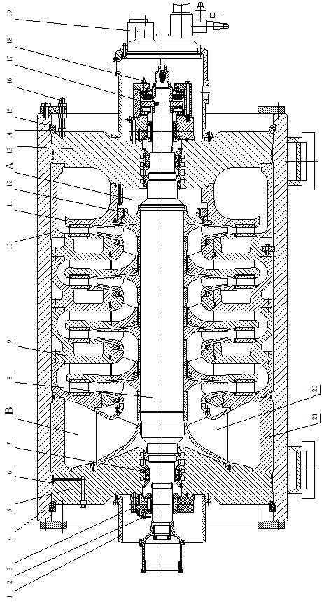 Задуммисная полость А соединена трубопроводом с полостью всасывания В. Это уменьшает величину осевой газодинамической силы.