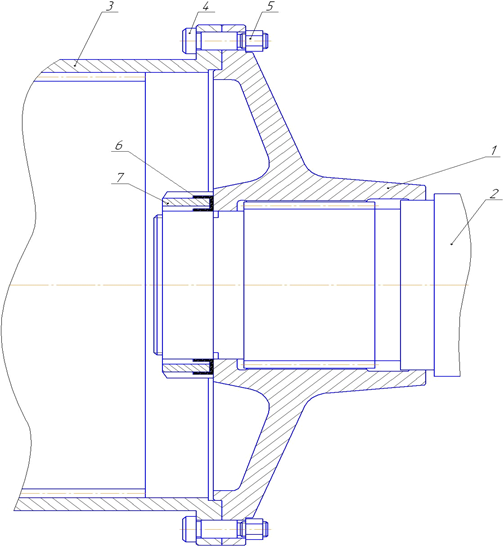 Деталь 1 базируется на валу ротора 2 и фиксируется круглой гайкой 7 и отгибной шайбой 6. Соединение детали с приводом осуществляется через обойму 3, пальцы 4 и гайки 5 (см. рисунок 1.3)