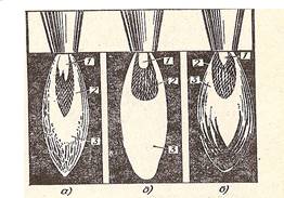В зависимости от соотношения смеси ацитилено-кислородное пламя может быть нормальным, науглероживающим (ацетиленистым) и окислительным (рис2). Ацетилен сгорает в смеси с чистым кислородом по следующей реакции: