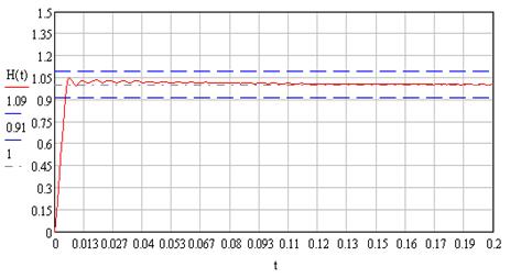 ~ время переходного процесса по точке перехода кривой через линию установившегося значения составляет 0,007 с и не превышает заданного значения в сравнении с исходными данными для проектирования, tп.п. = 0,15.