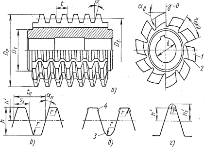 быть равны модулю и углу профиля нарезаемого колеса. Зубья 1 червячной фрезы затылованы по архимедовой спирали, благодаря чему при переточке фрезы по передней поверхности 2 задние углы при вершине зуба ав = 10--12о и на боковой режущей кромке аб = 2--4о , а также толщина зуба практически не изменяются. Для чистовых червячных фрез передний угол γ=0, для черновых фрез γ=5-100 .Стандартный профиль зубьев фрезы в осевом сечении имеет прямые стороны (рис. 3, б). Червячные фрезы под шлифование и шевингование имеют модифицированный профиль (рис. 3,в). Утолщение, так Называемый «усик» 4 на головке зуба фрезы, служит для поднутрения ножки зуба колеса, фланк 3 срезает фаску на вершине зуба колеса. Для повышения прочности зубьев колеса головка зуба фрезы скругляется и высота ее увеличивается (рис. 3,г), при этом необходимо соответственно увеличить полную высоту зуба колеса.