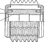 Окончательное шлифование профиля реек производят на резьбошлифовальном станке с большими боковыми и задними углами. Шлифование осуществляется большим кругом с обеспечением высокой производительности и качества. Подогревая рабочий корпус 1 червячной фрезы, запрессовывают рейки 2 в прямоугольные пазы. Плотная посадка реек гарантирует высокую жесткость против осевого перемещения. Дополнительно рейки удерживаются боковыми крышками 3, которые запрессовываются в нагретом состоянии с натягом 0,1 мм и закрепляются винтами 4.