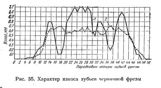 На рис. 5 представлен график износа зубьев червячной фрезы по задней поверхности при ручном 1 и автоматическом 2 ее перемещении. При ручном перемещении фрезы по сравнению с автоматическим наблюдается большая неравномерность в затуплении зубьев и более низкая стойкость. Внедрение механизма автоматического перемещения червячных фрез позволяет повысить период стойкости на 20~40 % за счет более полного и равномерного затупления зубьев. Кроме того, повышается производительность, облегчаются условия труда наладчика и повышается качество обработки.