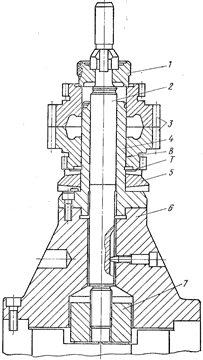 На рис. 6 показано зажимное приспособление, устанавливаемое на стол зубофрезерного станка, для нарезания одновременно двух цилиндрических зубчатых колес-дисков. Зубчатые колеса 3 базируют по отверстию и торцам зубчатого венца, а центрируют по втулке 4 с опорой на кольцо 5. Заготовки в приспособлении зажимают с помощью гидроцилиндра через соединительную муфту 7, тягу 2 и прижимную крышку 1. Крышка имеет шпоночные пазы; при зажиме ее надевают через шлицы тяги 2 и поворачивают на небольшой угол. При опускании тяги торцы шлицев, опираясь на крышку, зажимают заготовки. Втулка 4 закреплена на массивной чугунной тумбе б. Это зажимное приспособление универсального типа можно использовать для широкого диапазона зубчатых колес, заменяя втулку 4, кольцо 5 и прижимную крышку 1. Оно обеспечивает точное и жесткое крепление заготовок.