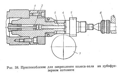 Приспособление такого типа, показанное на рис. 7, применяют на горизонтальном зубофрезерном автомате. Заготовку 5 устанавливают в центрах 3, 6 на фаски центровых отверстий. Правый центр б перемещает заготовку 5 влево, ее торец внедряется в острые стержни 4, посредством которых осуществляется вращение заготовки в процессе резания червячной фрезой 7. Левый центр 3 подпружинен пружиной 2. Поверхность 1 служит для выверки правильности установки приспособления в шпиндель станка. Колеса-валы с модулем свыше 5 мм базируют и зажимают за шейку в цанговом или кулачковом патроне.