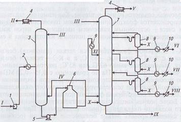I–обессоленная нефть; II–легкая фракция; III–острое орошение; IV–горячая струя–теплоноситель; V–смесь водяных и бензиновых паров; VI–VIII–компоненты светлых нефтепродуктов; IX–мазут; X–водяной пар: XI–промежуточное циркуляционное орошение.