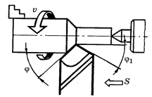 Вспомогательный угол φ1 — угол между вспомогательной кромкой и направлением подачи. Если φ1 мал, то из-за некоторого отжима резца вспомогательная кромка врезается в обработанную поверхность и портит ее.