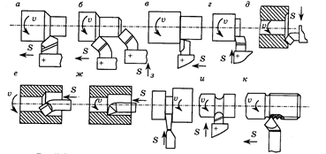 Рис.3. Типы токарных резцов: о — проходные прямые и б — проходные отогнутые, в — проходные упорные, г, д — подрезные, е — расточные проходные, ж — расточные упорные, а — отрезные, и — фасонные, к — резьбовые