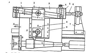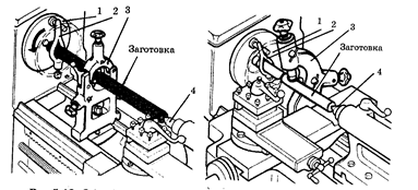 Способ обработки конических поверхностей с помощью конусной линейки (рис.11, г), прикрепляемой к станине станка, позволяет получать коническую поверхность с углом при вершине до 40°. Обработка ведется с включением механической подачи.