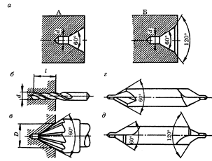 Рис.13. Центровые отверстия (а) и инструмент (б) — цилиндрическое сверло, (в) — зенковка, (г,д) — комбинированые сверла