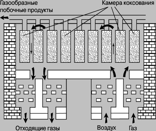 При обогреве коксовым газом применяется так называемый «обратный коксовый газ», т. е. газ, прошедший через аппаратуру, улавливающую ряд химических продуктов. В составе обратного коксового газа содержится до 60% водорода, который целесообразно извлечь и использовать на азотнотуковых заводах для синтеза аммиака. Обезводороженный коксовый газ (не содержащий водорода) также можно применить для отопления печей. Генераторный газ применяется лишь в тех случаях, когда приходится экономить коксовый газ, который целесообразнее использовать как бытовое топливо.
