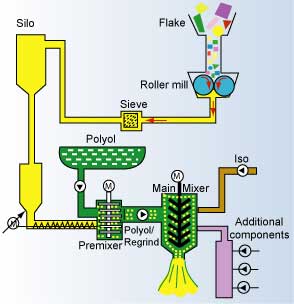 Отходы для такого процесса поступают из фабричных обрезков и отходов, а также от использованных продуктов. Полиуретановая крошка применяется в качестве наполнителя при производстве пенополиуретана или эластомеров. При использовании в качестве наполнителя крошка в процессе производства полиуретана, как правило, сначала вводится в полиольный компонент. Формованная полиуретановая продукция, такая как автомобильные подголовники, могут содержать до 20% повторно измельченного материала без снижения качества или эксплуатационных свойств.