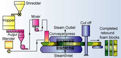 Измельченные отходы пенополиуретана могут быть вспенены вторично при помощи нагрева, давления и связующего вещества. Вторичное вспенивание широко используется для производства вибрационных звукопоглощающих настилов, полового покрытия, спортивных матов, набивочных материалов и ковровых подкладок. В ходе аналогичного процесса, известного как адгезивное прессование, гранулы полиуретана покрываются связующим веществом и отверждаются путем нагрева под давлением. Контурная продукция изготавливается путем адгезивного прессования, она включает коврики для автомобиля и покрышки шин.