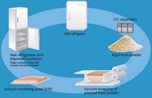 Рис.3. Вторичная переработка панелей холодильников. Стадии: новый холодильник с улучшенной изоляцией: первичный пенополиуретан и вакуумные изоляционные панели; старый холодильник; отделение хлорфторуглерода и измельчение в крошку жесткого пенополиуретана; вакуумная упаковка прессованной крошки пенополиуретана; готовая вакуумная изолирующая панель.