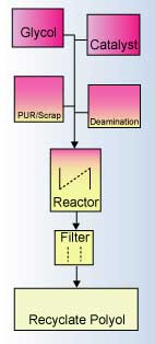Рис.7. Процесс гликолиза: гликоль - катализатор - полиуретан/отходы - деаминирование - реактор - фильтр - рециклат полиола.