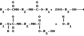 ИК-спектроскопический анализ продукта гликолиза СКУ-ОМ показал наличие полос поглощения, характерных для уретановой ( (3340, 1735, 1535, 780см - 1), сложноэфирой (1735 см - 1) и гидроксильной (3460 см - 1) групп. Наличие указанных групп позволило предположить, что продукт гликолиза представляет собой смесь бифункциональных по ОН - группам полиолов и уретанполиолов, образующихся в результате каталитического гликолиза аллофанатных, сложноэфирных и уретановых фрагментов (рис., реакции 1,3,4).