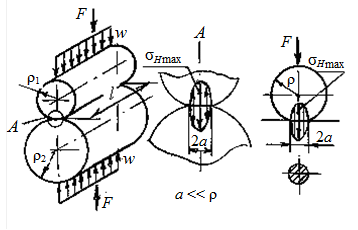 Вследствие упругих деформаций под действием сжимающей нагрузки w = F / l линия контакта переходит в узкую полоску шириной 2а (2а << r), на которой возникают контактные напряжения sН , изменяющиеся по эллиптическому закону.