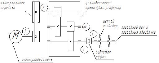 Спроектировать привод пластинчатого конвейера для транспортировки сырья со склада фабрики в цех, состоящий из электродвигателя, клиноременной передачи, цилиндрического прямозубого редуктора, зубчатой муфты, приводного вала и приводных звездочек.