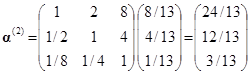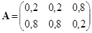 Можно видеть, что первый и второй эксперты оценивают важность обоих объектов одинаково (при этом второй объект признается заметно более важным, чем первый (0,8 против 0,2)), тогда как третий эксперт придерживается противоположного мнения. Определим коэффициент компетентности каждого эксперта и вычислим (с учетом компетентности) оценки важности объектов. Для этого сначала по формуле (6.10) находим матрицу взаимосвязи экспертных оценок