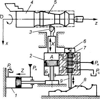 Такие СЧПУ применяют в токарных и фрезерных станках при изготовлении деталей с фасонными поверхностями. Подача S инструмента в каждый момент обработки складывается из поперечной snon и продольной Sпр подач. Следовательно, перемещения инструмента по различным координатным осям функционально связаны друг с другом.