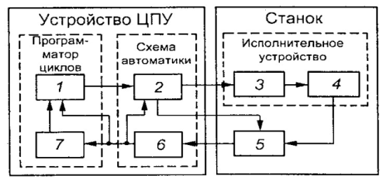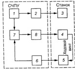 Основной функцией СЧПУ является управление приводами подач станков в соответствии с заданной программой, а дополнительными — смена инструмента и т. д. На рис. 7 представлена обобщенная структурная схема СЧПУ. Схема работает следующим образом: устройство 1 ввода программы преобразовывает ее в электрические сигналы и направляет в устройство 7 отработки программы, которое через устройство 8 управления приводом воздействует на объект регулирования — привод 4 подач. Подвижную часть станка, связанную с приводом 4 подач, контролирует датчик 5, включенный в цепь главной обратной связи.