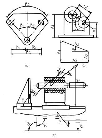 Рис. 8. Приклади розмірних ланцюгів: кутових (а, в) і площинного (б)